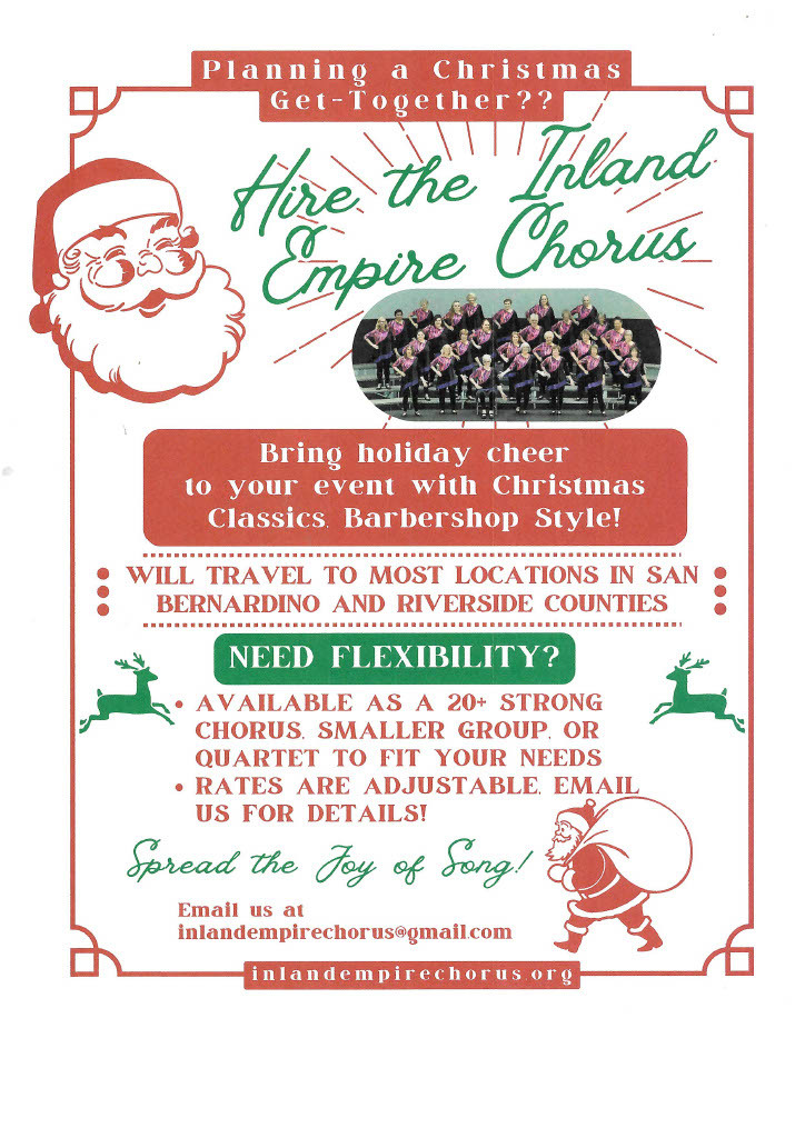 The award-winning Inland Empire Chorus of Sweet Adelines International can provide quality entertainment for your company or club event, reunion, festival, party or any other occasion where musical entertainment is desired. We sing 4-part a cappella harmony, barbershop style, and whether it’s a small group or the entire chorus, we have a plan to meet your budget. Contact us at [email protected]